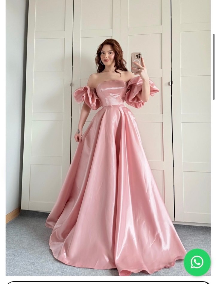 Pudra pembe, straplez uzun abiye elbise, drapeli kollara ve normal kesime sahiptir. Düğün ve özel günler için modern klasik tarzda, pastel renklidir.