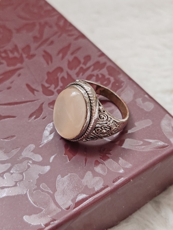 Pembe taşlı, detaylı işlemeli gümüş görünümlü bandıyla vintage bohem tarzı kadın yüzük. El ayası ile temas eden bölgede hafif kararma vardır. Bunun dışında sorunsuzdur. Ölçüsü görsellerde mevcut.