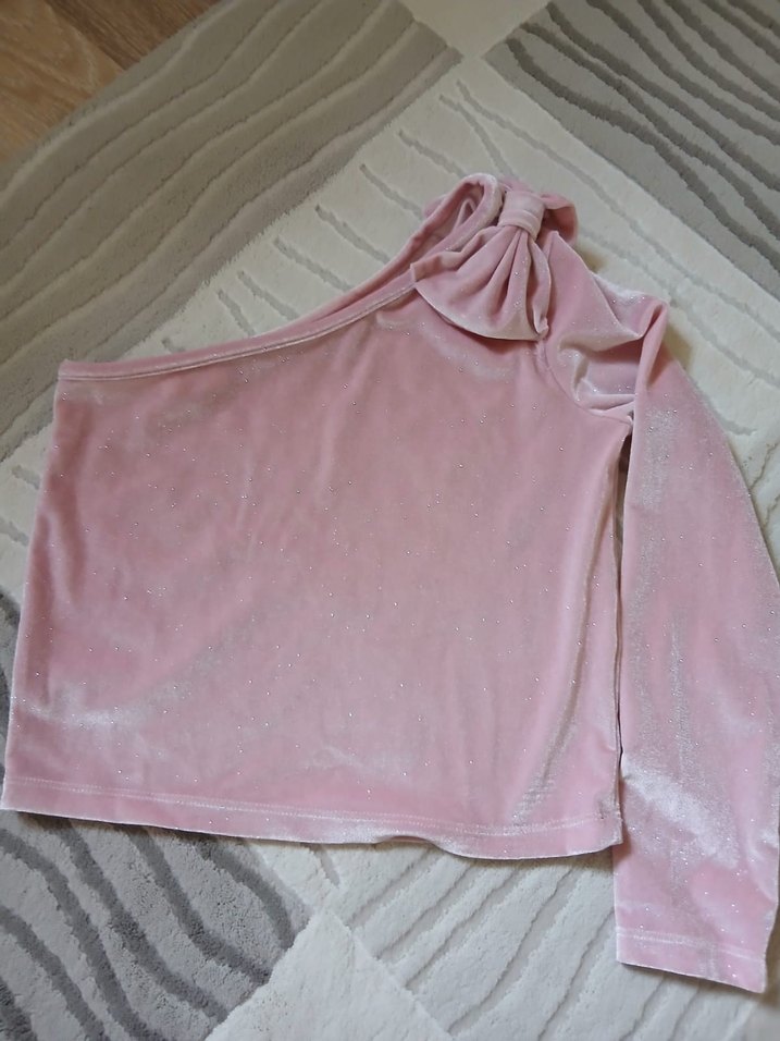 Pudra pembe renkte, tek omuz drapeli ve uzun kollu kız bluzudur. Yumuşak ve sıcak kumaştan, bol kesimdir.