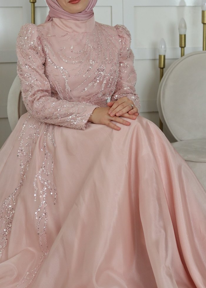 Pudra pembesi işlemeli, uzun kesim, yüksek yakalı ve uzun kollu, drapeli klasik kesim nişan elbisesi. Nişanımda evde giydim sadece. 42 beden elbise. Benim boyum 157 ve yaklaşık 5cm topuklu ayakkabı ile giydim. Giydiğimde kilom 63 küsür idi. üst bedenim 42 altım 40 beden birisiyim. Boyundan ve kol boyundan tadilat yaptırdım yani kısaltma mevcut.Türkan Çelik Markalı.