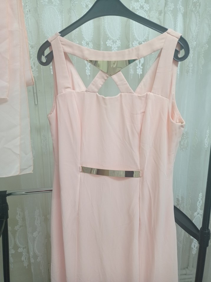 Pudra pembe, askılı V yaka uzun elbise, kemerli ve rahat kesimiyle modern klasik tarz sunar.