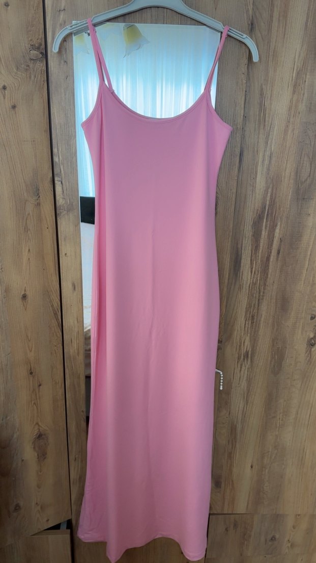 Pudra pembe renkte, straplez yakalı ve drapeli tasarıma sahip uzun, vücuda oturan kadın elbisesi. Yumuşak sentetik kumaştan yapılmıştır.