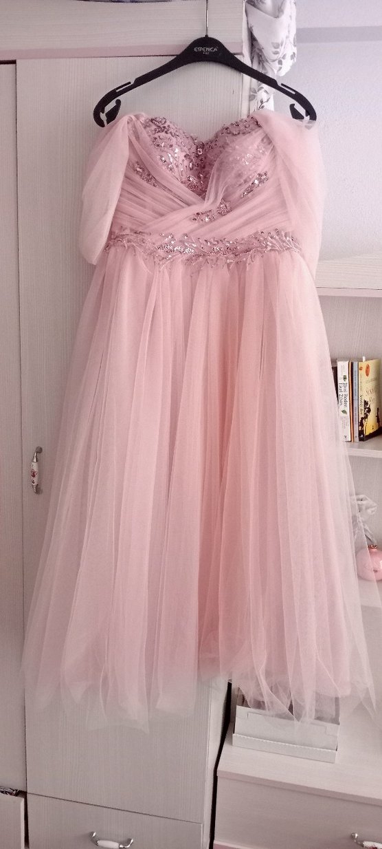 Pastel pembe renkte, uzun drapeli ve nakışlı detaylara sahip nişan elbisesidir. Straplez yakalı ve askılı kollu, bohem tarzda, klasik şıklık sunar. ( NİŞANIMDA GİYDİM SADECE 1 KERE EVDE. TERTEMİZ HATASIZDIR)
