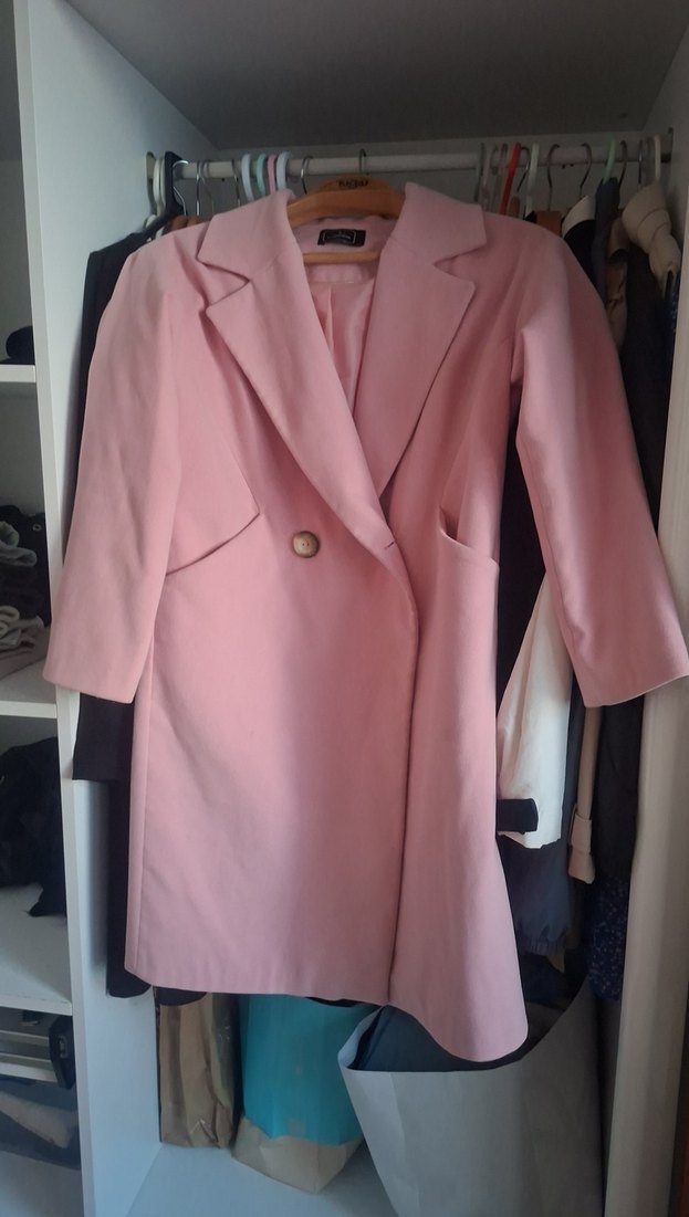 Kadın kaban, kesik yakalı ve düğmeli ön detaylıdır. İpek gibi yumuşak kumaştan yapılmış, pastel pudra pembesi renktedir. Normal kesim ve askılı kollara sahiptir, ofis için uygundur ve Paris tarzı normcore stilindedir. Desensiz ve uzun boydadır.