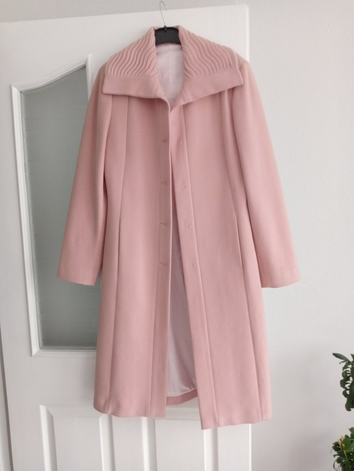 Pudra pembe uzun kaban, sadece düğmeleri yok lekesi söküğü yok