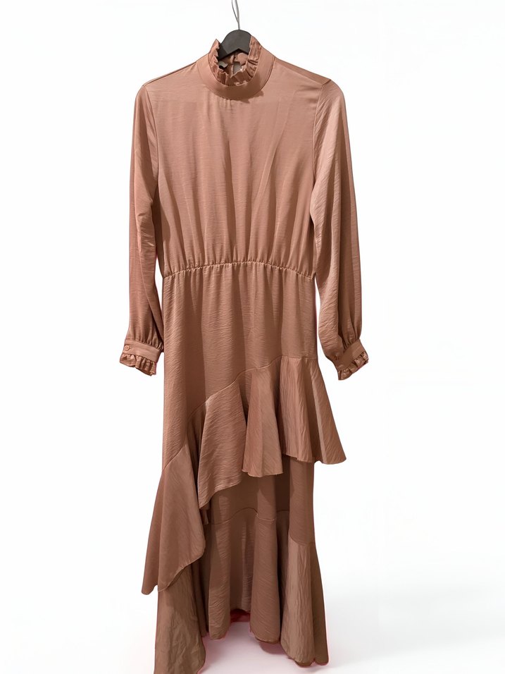 Pudra renkli, uzun kollu ve yüksek yakalı bu uzun elbise, ipeksi kumaştan üretilmiştir. Salaş kesimi ve asimetrik fırfır detaylarıyla günlük kullanıma uygundur.