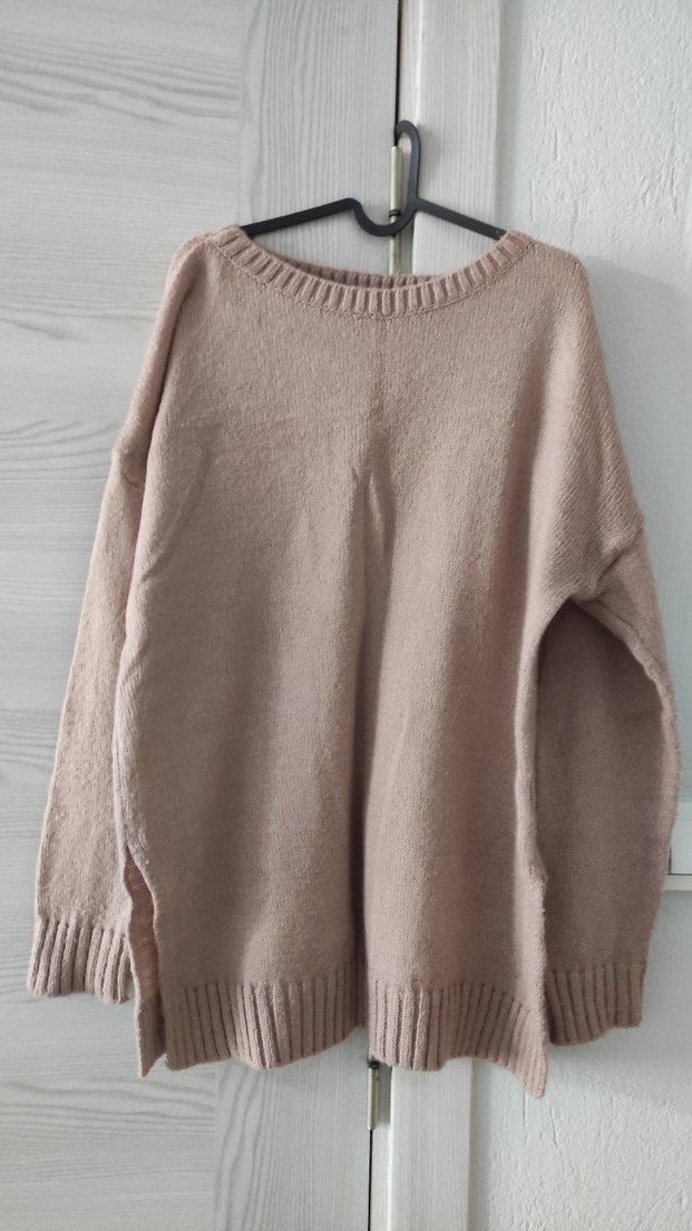 Pudra Pembesi renkli, yuvarlak yaka ve uzun kollu kadın triko kazak. Oversize kesim ve normal boyda, günlük kullanıma uygun sade ve rahat bir model. İki kol arası 62 cm'dir. 36-38 bedene uyumludur.
