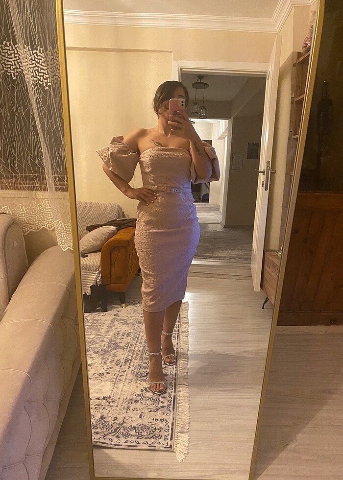 Pudra pembesi kalem elbise kol detaylı davet elbisesi