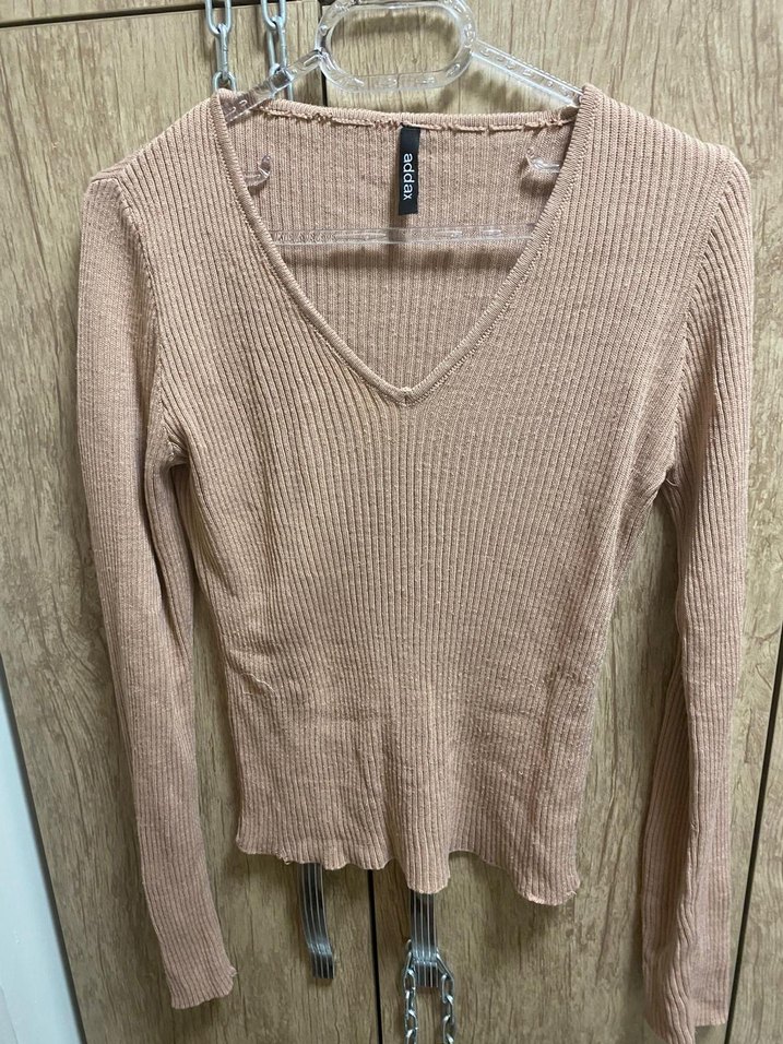 V yaka ve uzun kollu, ince dokuma triko kazak. Günlük kullanıma uygun, rahat ve şık bir parça.