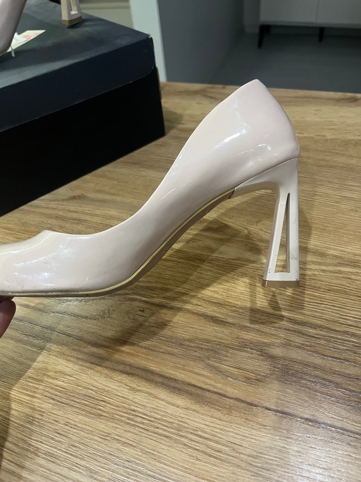 Pudra pembesi parlak stiletto topuklu ayakkabılar, çağdaş tasarım ve klasik şıklık sunar. Ofis kullanımı için uygun, parlak ve desensiz rubber malzemedendir. Ayakkabı rahattır. İçerisinde 3.görselde de gösterdiğim gibi yapışkan izi bulunmaktadır. Sol topukta ufacık deformeler mevcuttur haricinde bir hasarı yoktur.