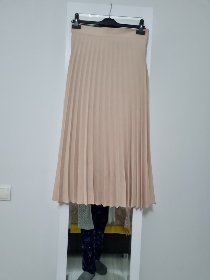 butikden alınmıştır pudra renkli, pileli ve uzun kesim kadın eteği. Rahat kalıp ve yumuşak sentetik kumaştan üretilmiştir, günlük ve sokak stiline uygundur.