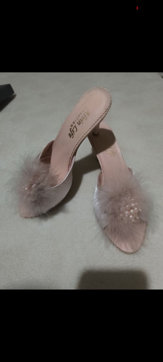 Sentetik kumaştan yapılmış, inci detaylı tüylü bej topuklu 38 numara pudra rengi hiç giyilmedi temiz