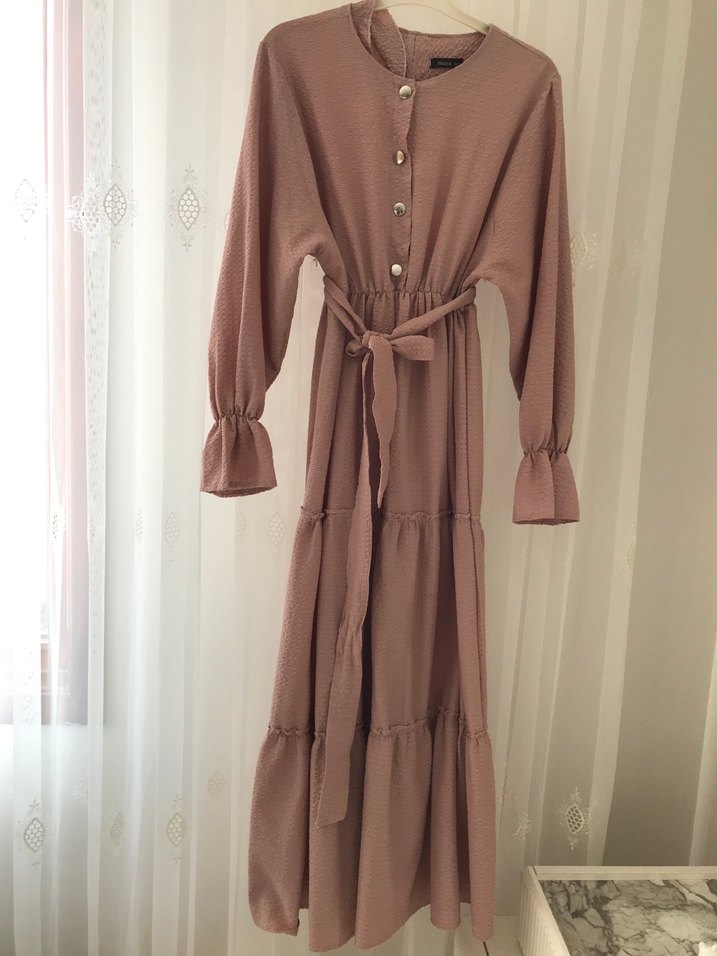 Bej uzun keten elbise, bol kesim ve fırfır detaylara sahiptir. Yüksek yakalı, düğmeli ve manşetleri büzgülü uzun kolludur. Bohem Paris tarzında klasik şıklık sunar.