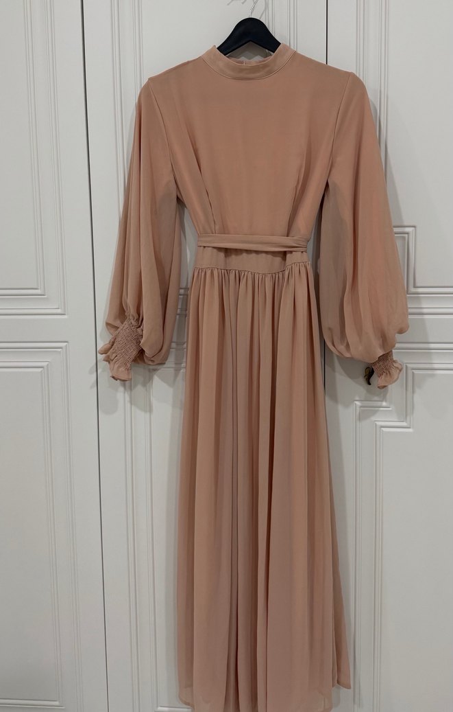 Pudra renkli, yüksek yakalı, drapeli ve bol kesimli uzun elbise. Manşetleri toplanmış uzun kolları ve ipeksi kumaşı ile modern klasik tarz sunar. Boyu 128 cm’dir