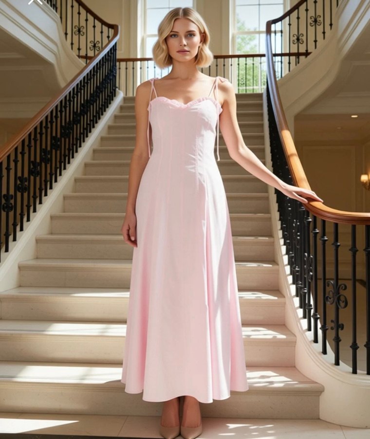İnce askılı, straplez yaka ve pileli detaylara sahip, pastel pudra renkte, vücuda oturan midi elbise. Romantik akşamlar için uygundur. Astarlı hiç kullanılmadı