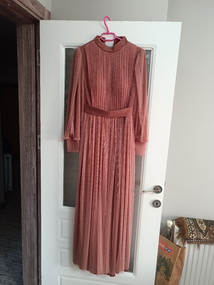 Pudra renkli, pileli kumaştan yapılmış, uzun ve vücuda oturan bu abiye elbise yüksek yakalı ve askılı kolludur. Vintage ve modern klasik tarzı bir araya getirir.