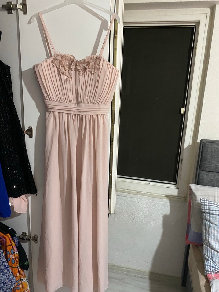 Pudra renkli uzun abiye elbise, pileli detaylar ve ince askılarla tasarlanmıştır. Straplez yaka ve çiçekli süslemelerle düğünler için uygundur.