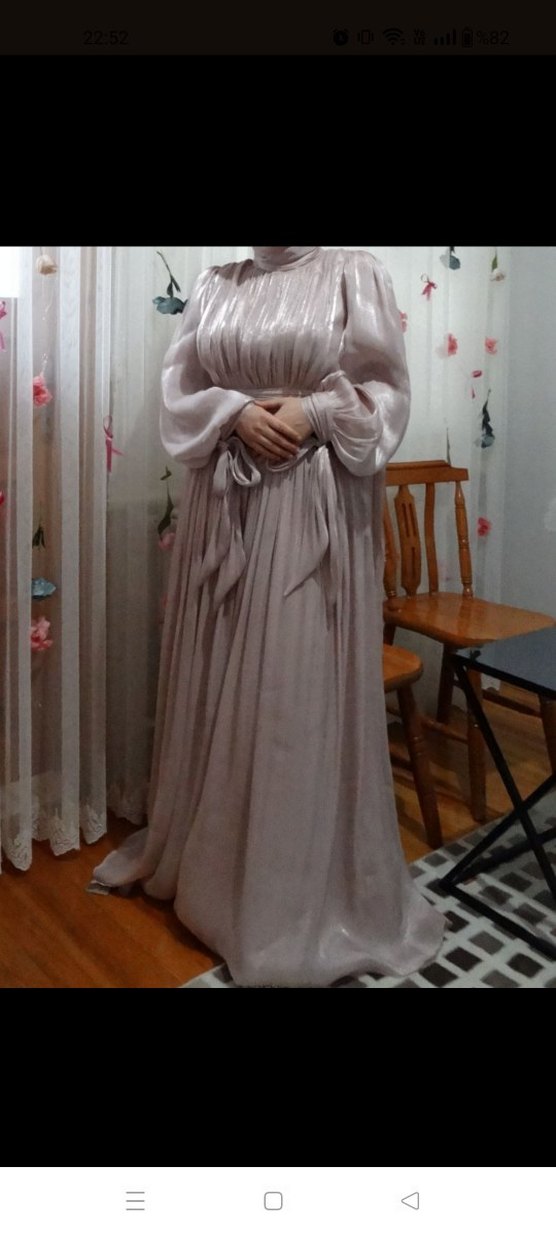 Pudra renkli, pileli detaylara ve yüksek yakaya sahip uzun abiye elbise. İnce kesimi ve askılı kollarıyla modern klasik bir görünüm sunar. Düğünler için uygundur. kendi istememde kullandım hiçbir yerinde defosu da yoktur