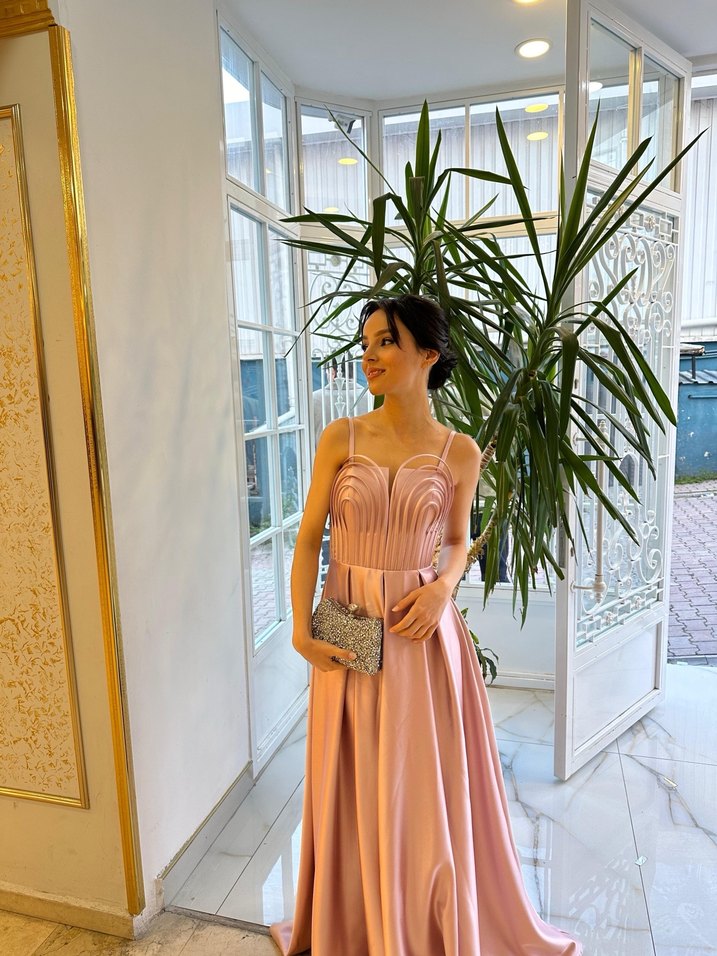 Straplez, pileli ve ince askılı pudra renkli uzun abiye elbise, modern klasik tarzda, düğünler için uygun, rahat kesim. ürün 34/36 bedene kadar uygundur. sadece bir kere giyildi. cepleri de vardir. 4000 tl ye geçen sene sezon basinda almistim. bir kere kullanildigi için pazarlik payi vardir. kumasi saten straplez. her hangi defosu yoktur