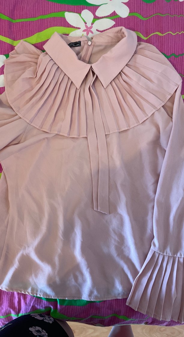 Pudra renkte, yakalı ve pileli detaylı uzun kollu kadın gömlek. Rahat kesim ve ipeksi kumaştan, ofis için uygun.