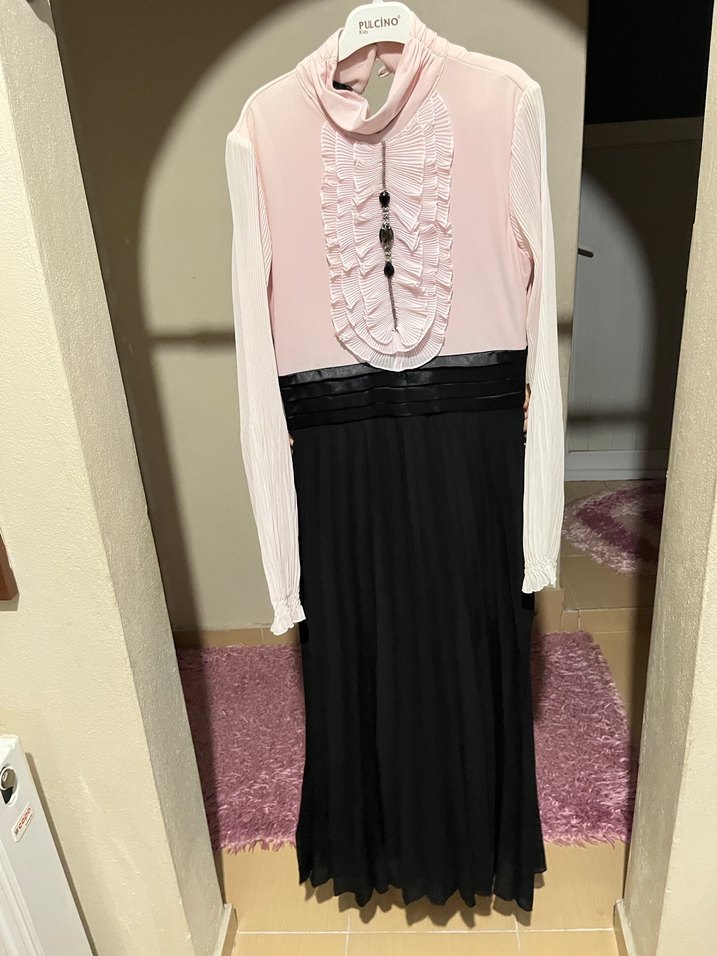 Yüksek yaka ve pileli uzun kollara sahip bu uzun elbise, pastel pembe ve siyah renkleri nakış detaylarıyla buluşturur. Ofis için klasik ve zarif bir tercih.