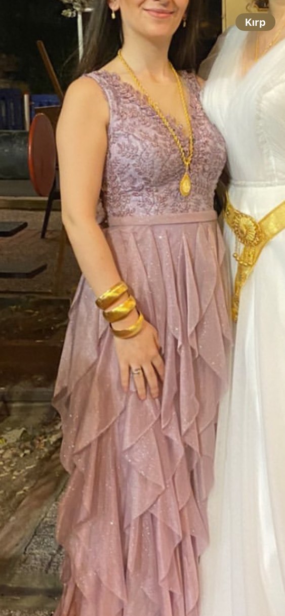 V yaka, kolsuz, desenli kumaştan, pileli ve oturan kesim pudra rengi nişan elbisesi. Zarif ve bohem tarzda klasik şıklık sunar. Sadece nişanımda ve arkadaşımın düğününde giydim. S beden de oluyor m bedende arkası dikişli büyütme şnsınız vardır.
