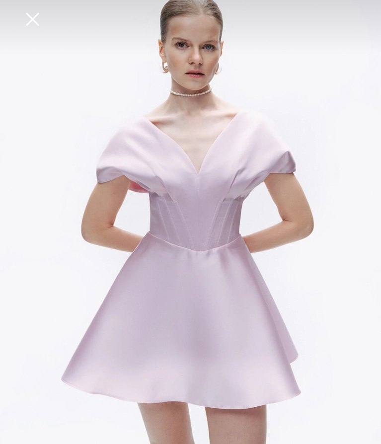 Pudra renkli, V yakalı, pileli kısa kollu ve mini boy, düğünler için uygun, modern kesim kadın elbisesi.