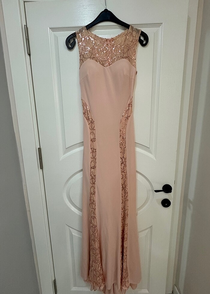 Bir kere kullanıldı. Hiç bir deformasyonu yoktur. Elbise 38 bedenden 36 ya çevrilmiştir. İç kısımda payları mevcuttur.