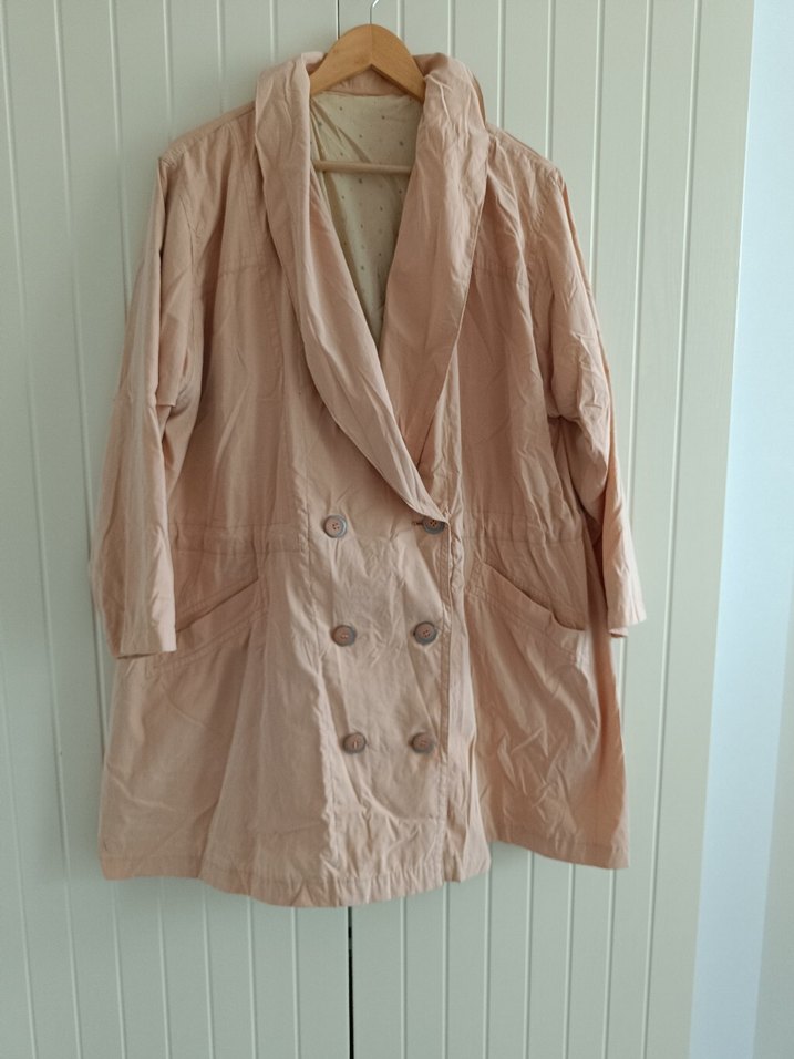 Yumuşak pamuk saten kumaştan, uzun kollu ve kesik yakalı midi uzunlukta bol kesim trençkot. Düğmeli ve sade tasarıma sahip, günlük kullanım için uygun. İki kol arası 63 cm, boy 86 cm, etek genişliği 83 cm ve kol boyu 52 cm. Detaylı videosu diğer hesabımda var.
