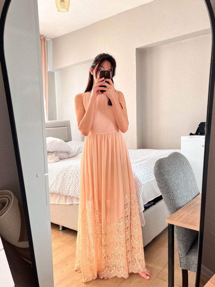 Pudra renkli, dantel detaylı ve uzun boyda olan bu elbise, kalın askılı. Bol kesimi ve ipeksi dokusuyla bohem tarzda romantik akşamlar için uygundur.
