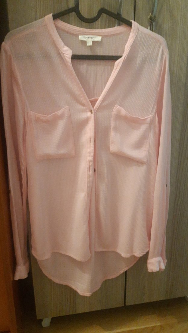 Pudra rengi, düğmeli, V yakalı, uzun kollu kadın gömleği. İki cep ve midi uzunluğunda, rahat kesim ve ipeksi dokulu günlük kullanım için uygun.