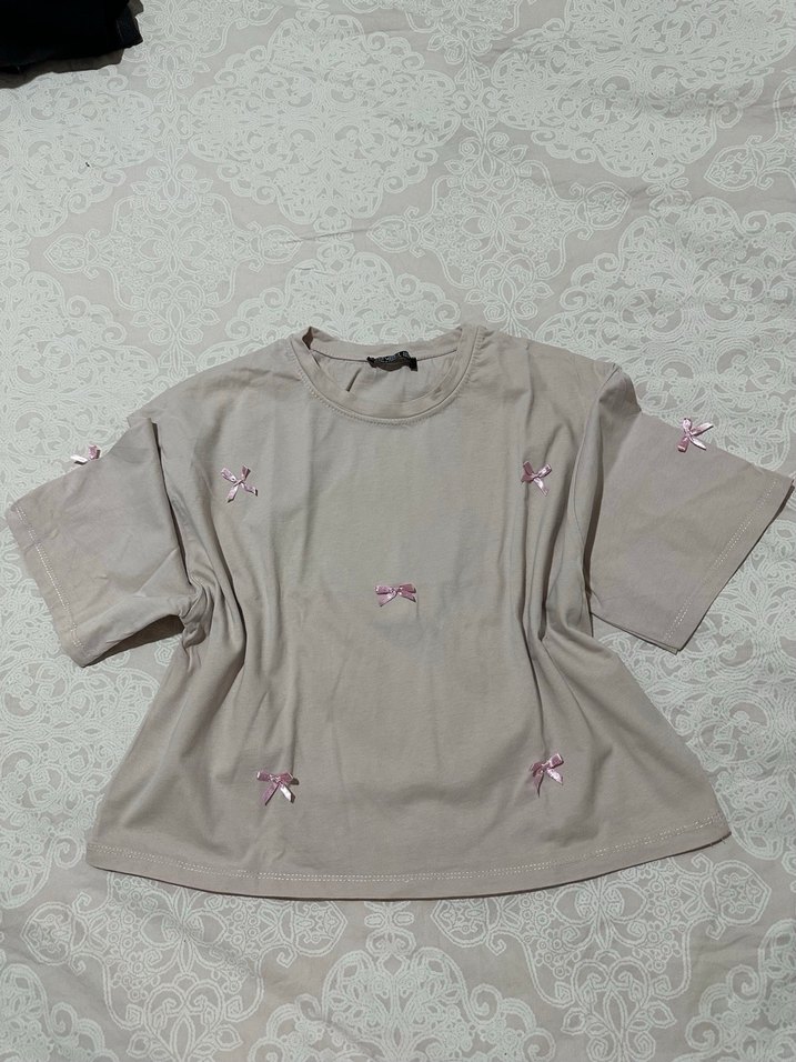 Kısa kollu, yuvarlak yakalı bej renk kız çocuk tişörtü, pastel renkli nakışlı fiyonk detaylarıyla oversize kesim sunar.