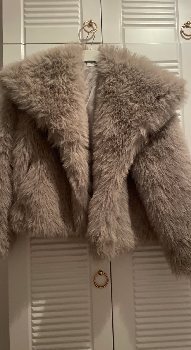 Bej renkli, kürk detaylı ve yumuşak fleece kumaşlı, bohem tarzda, uzun kollu ve normal boyda kadın mont.