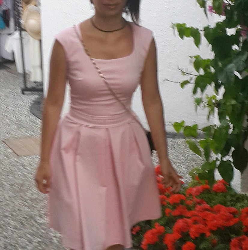 Pudra renkli, kayık yaka ve ince askılı pilili midi elbise, modern klasik tarzıyla düğünler için uygundur.