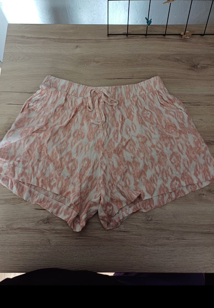 Pembe tonlarda açık renk, bol kesim ve fırfırlı mini şort. Yumuşak sentetik kumaştan, dış mekan için uygun. herhangi bir sorunu yok marka temsili