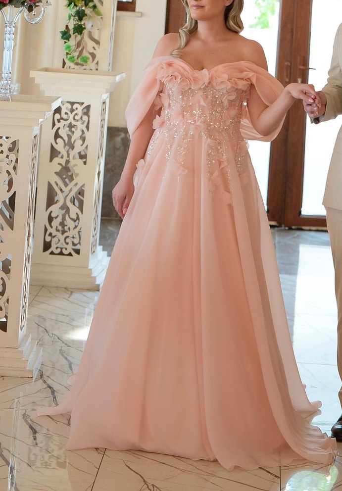 Pudra rengi, straplez uzun abiye elbise, drapeli ve nakışlı detaylarla modern klasik tarzda, bol kesimdir.