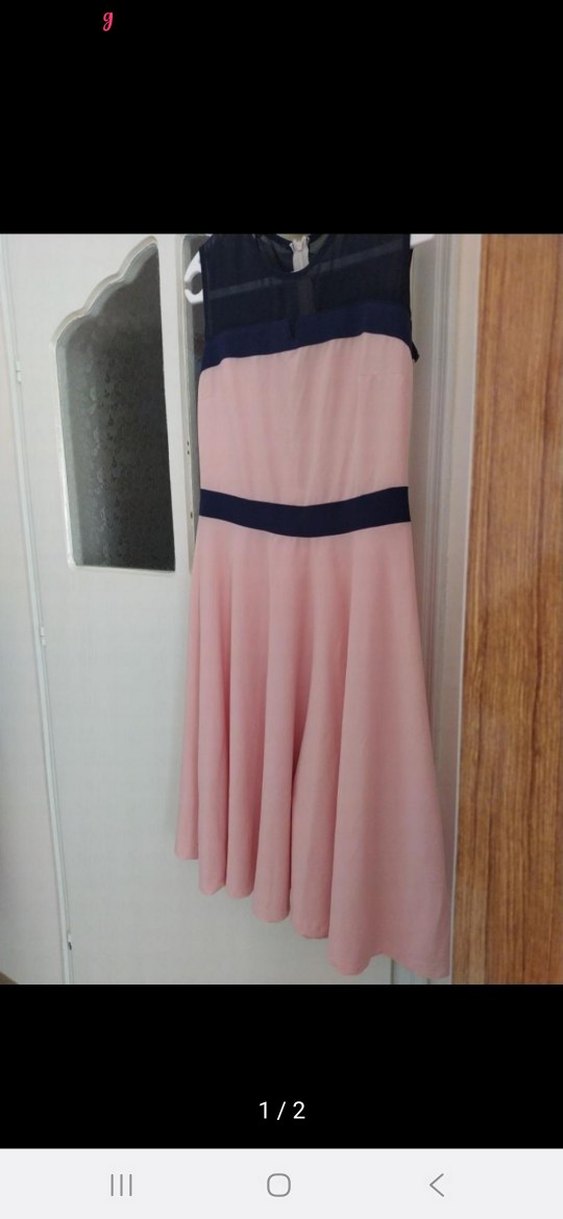 Pudra rengi, straplez yaka ve piliseli etekli midi elbise, düzenli kesim ve modern klasik tarzıyla parti için uygundur.