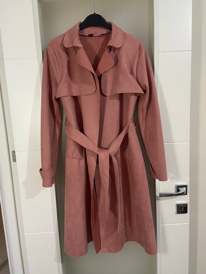 Pastel pudra renginde, süet kumaştan uzun trençkot. Notlu yakalı, kuşaklı ve düz desensizdir. Rahat kesimiyle günlük sokak stiline uygundur. 7. Fotoda ufak leke görünmektedir.