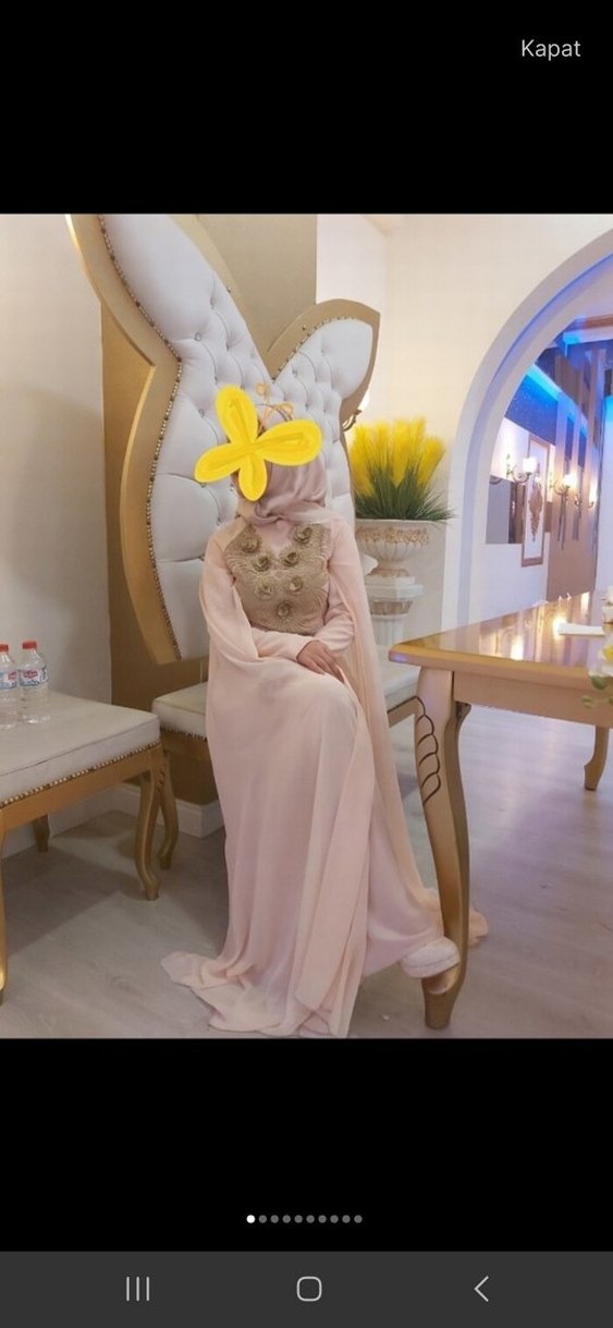 Pudra rengi, yüksek yakalı, drapeli, uzun ve fitted kesim abiye elbise. Çiçek detaylı, bohem tarzda, strappy kollu, tesettür uyumlu. Pelerinli bir model değildir kolları tül detaylı çok şık bir abiye elbisedir. Fotoğraflarda gördüğünüz gibi gayet iyi durumdadır. 37 numara ayakkabısı ile birlikte almak isterseniz 100₺ de ayakkabı için sayarım.