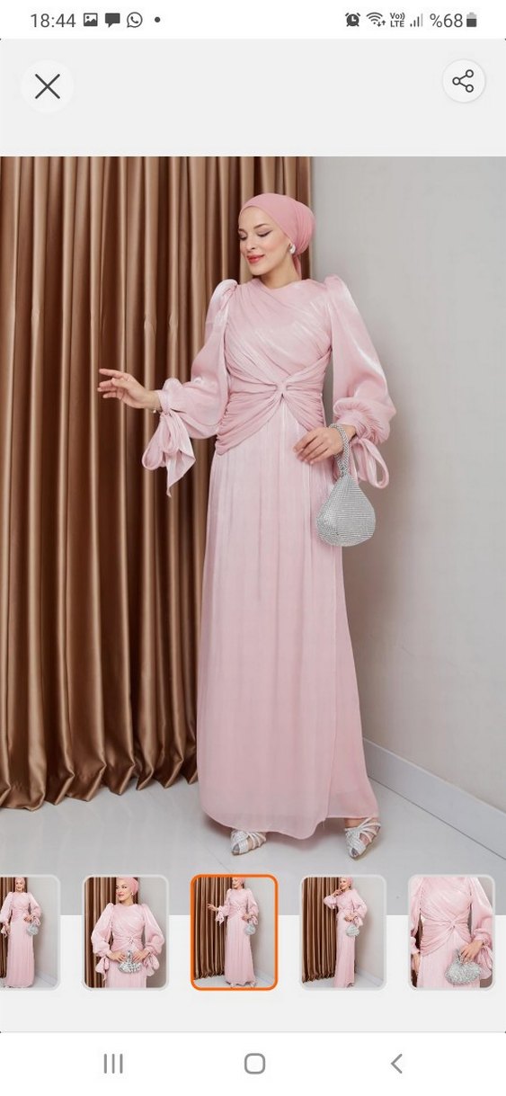 Pudra renkli, drapeli uzun abiye elbise. Uzun kollu, bol kesim ve modern klasik tarzda, düğün için uygun, pastel tonlu ve göz alıcı.