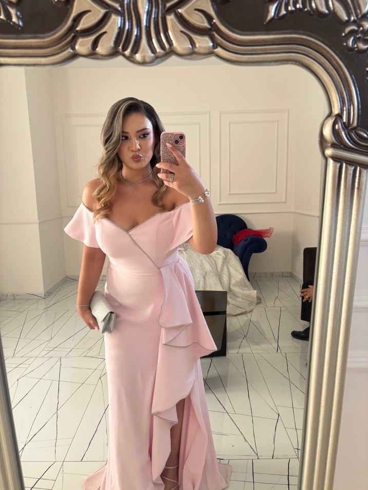 Pudra renkli, drapeli ve askılı kolları olan uzun abiye elbise. Straplez yaka ve baskılı desenle düğünler için uygun.