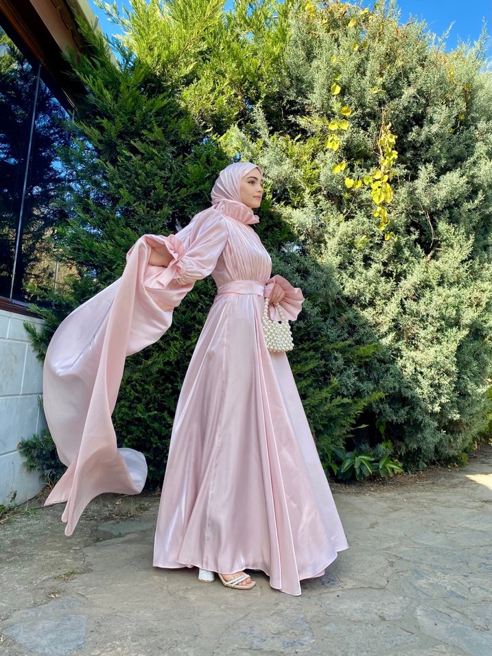 Pudra renkli, drapeli detaylara sahip uzun abiye elbise. Straplez yaka ve ince askılı kollu, modest ve görkemli düğünler için uygun. 36 beden uyumlu 2 kez kullanıldı