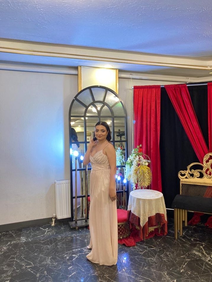 Pudra Renk Drapeli Uzun Abiye Elbise