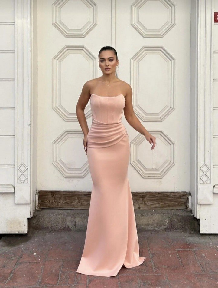 Pudra Renk Drapeli Uzun Abiye Elbise