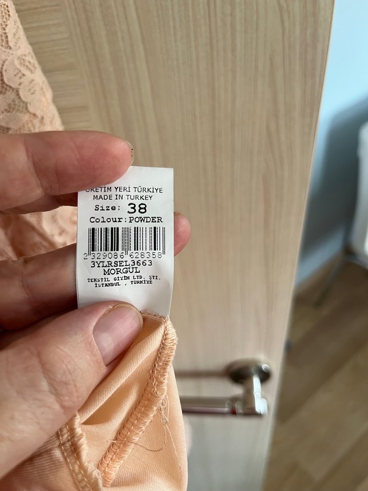 Baskılı desene sahip, pudra renkl, 38 beden, 1 defa kullanılmıştır boy 100cm Arka kısımda yıkanınca çıkacak lekesi vardır