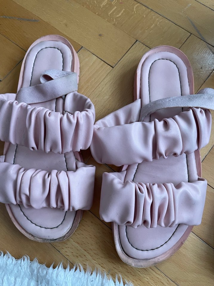 Çocuk sandaletler, pastel pudra renkli fırfırlı bantlar ve dolgu topuk içerir. Kauçuk malzemeden üretilmiş, bohem Paris tarzına uygun günlük kullanıma uygundur.