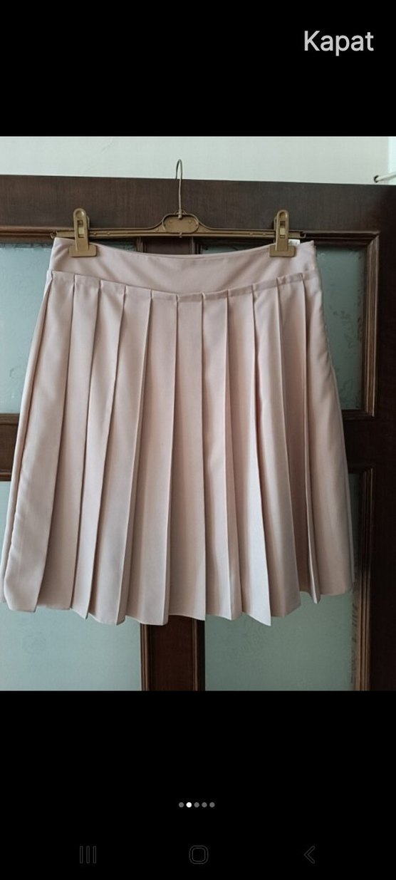 pudra renkte, sentetik kumaştan yapılmış, pilili ve midi boyda kadın eteği. Pastel tonlarda, desen içermeyen, normal kesim ve normcore tarzda günlük kullanım için uygun.