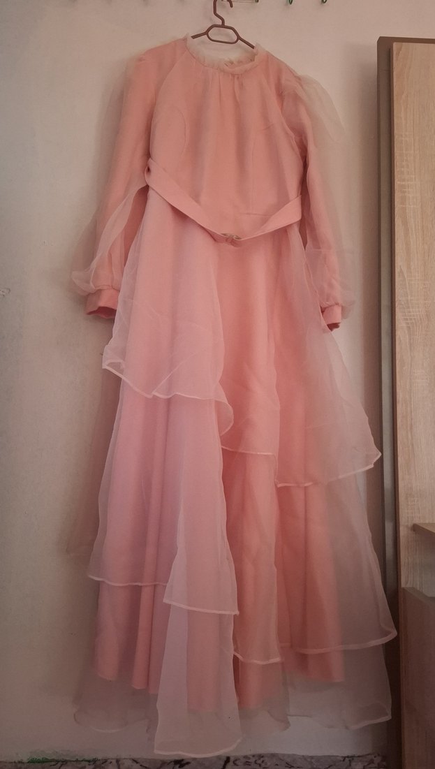 Pudra renkli, uzun kollu ve yüksek yakalı bu uzun elbise, bol kesim ve kat kat drapeli tasarımıyla vintage bohem tarzını yansıtıyor. Sadece 1 kere giyildi 46 beden