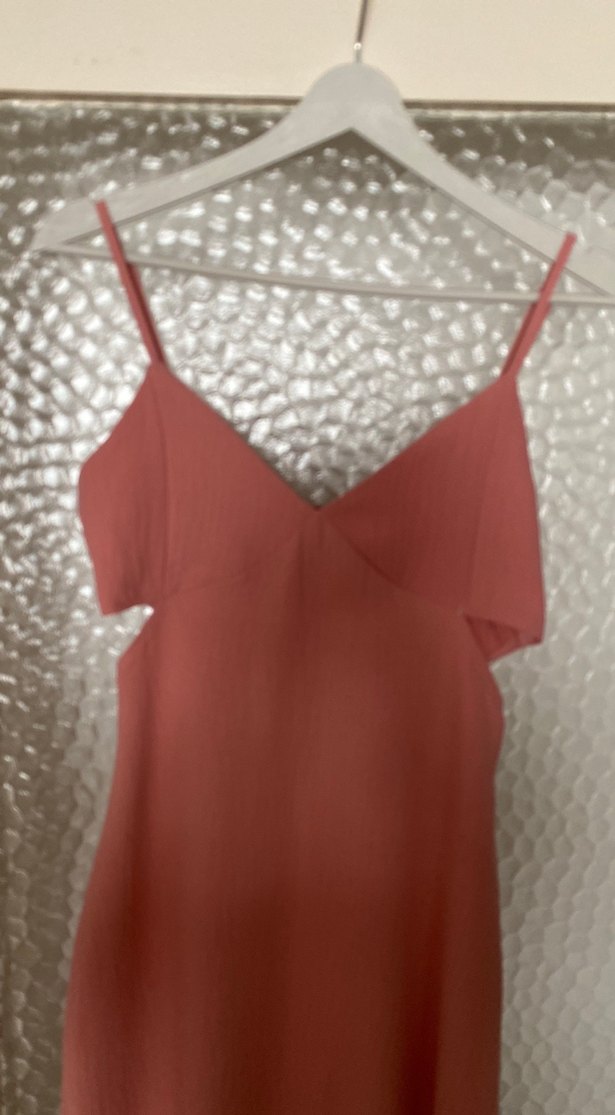 V yakalı, kolsuz ve fırfırlı detaylı pudra renk midi elbise, romantik akşamlar için uygun, şık ve minimal tarzda.