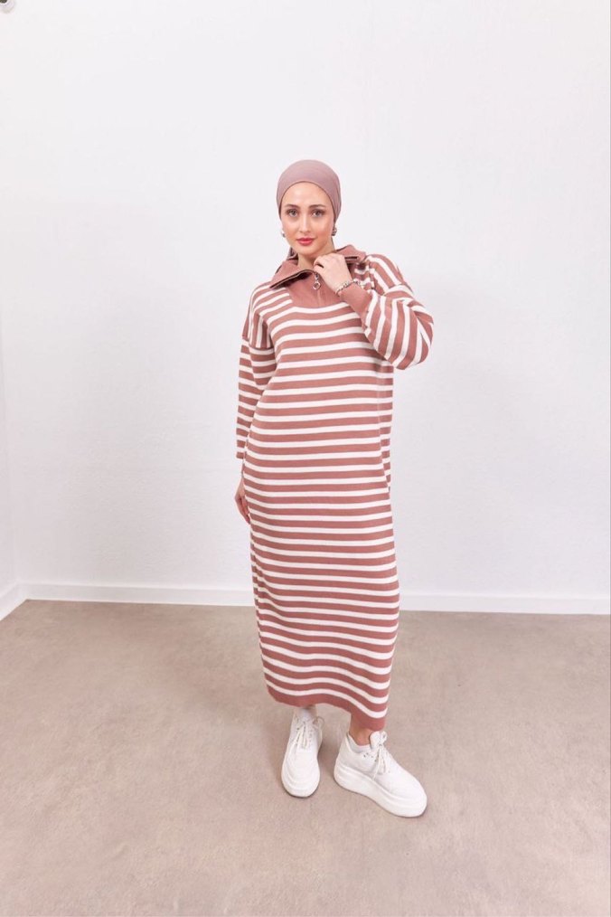Pudra Renkli Çizgili Kadın Triko Elbise